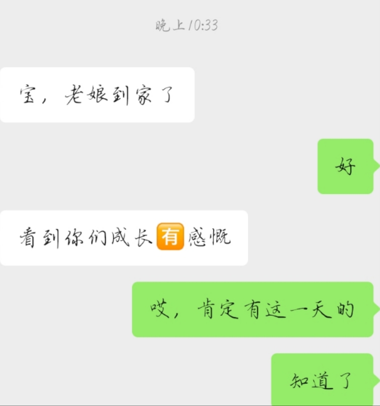 今天晚上和父母以及父母的老友一起吃饭,晚上的时候因为要实习就没回家,晚上妈妈到家的时候给我发了消息说自己到家了,那一刻真的是感觉自己长大了,从前都是自己到家的时候给父母发一句到家了好让父母安心,如今角色调换,母亲到家了让我安心,可能这就是成长吧