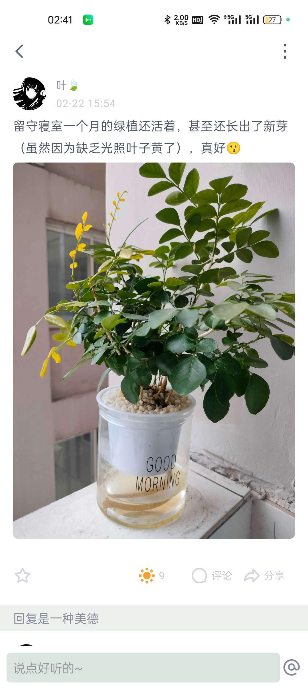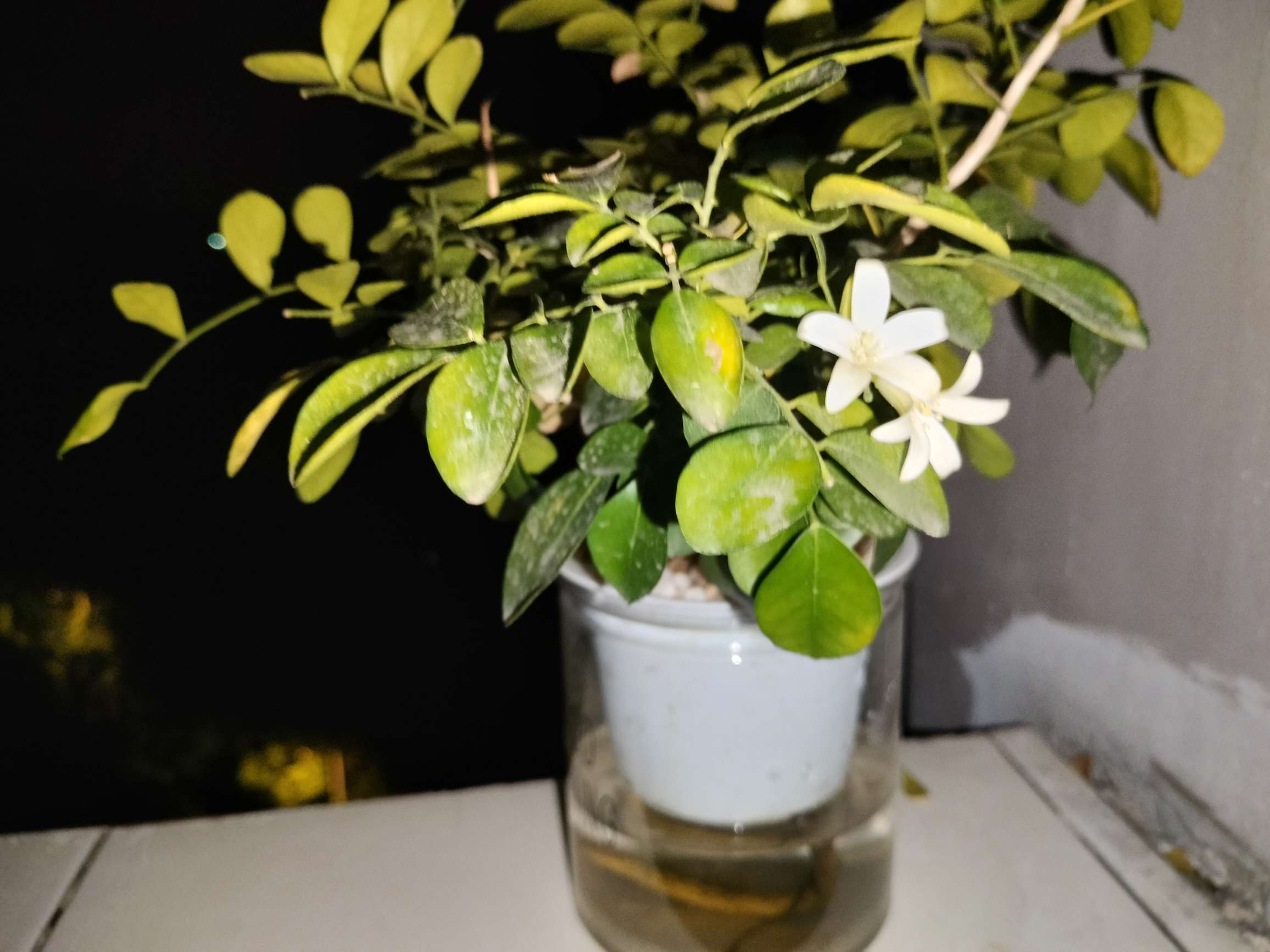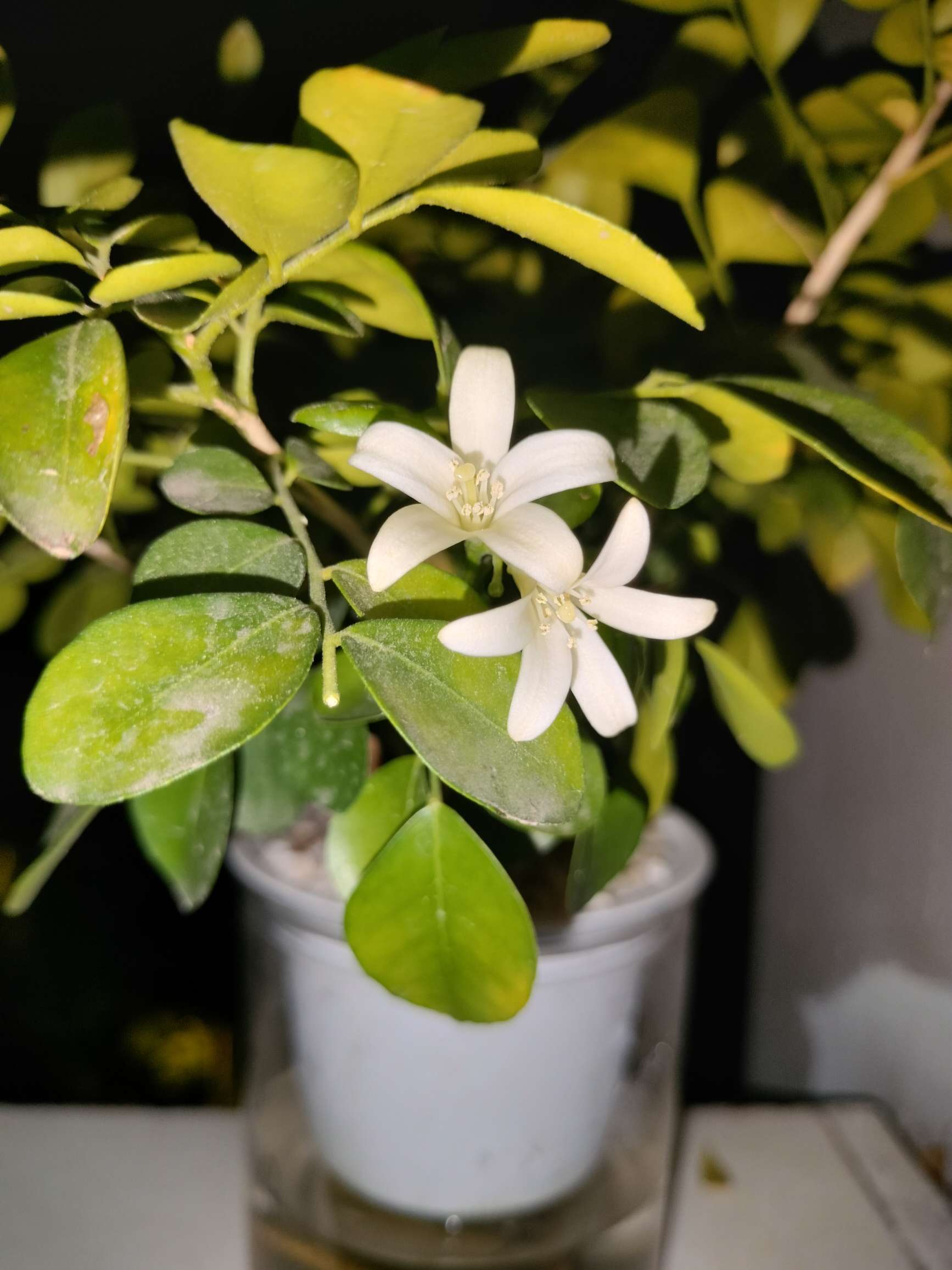 后续来了刚刚在阳台突然闻到花香,然后一看发现是它开花了🥳好惊喜🥰本来前天换水的时候我还在想它叶子黄了好多不会要被晒死了吧,没想到它居然开花了!好顽强的生命力😄