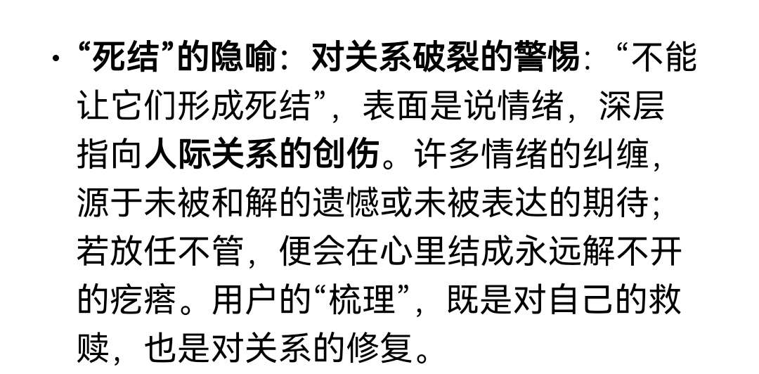 写完后喂给元宝了,我当时就很诧异,这都被发现了嘛。就是我发现自己每次感觉和谁关系好了之后,我就会很担心关系破裂,以至于有些焦虑了,我有点“冒充者”心态啊,我对任何一段关系都是有些悲观的,我觉得我与 ta 人的关系经常是岌岌可危的,同时我也知道光是担心是无用的,一定要做些什么去维持,有点棘手。大概就是还是自己一个人做自己的事情比较惬意吧…