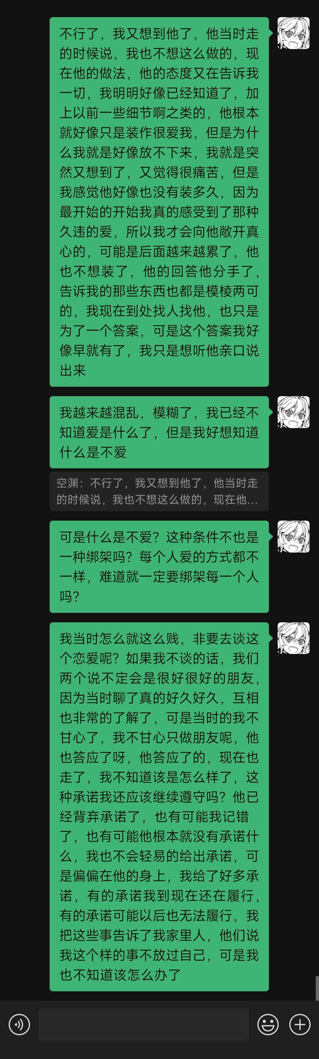 痛苦不是爱,爱不是痛苦,可是我感到痛苦的原因是因为爱,是因为我还在爱着你,什么叫做我自己都不放过我自己?什么叫做放过自己?我不知道啊,我感觉好混乱,好窒息,我躺在床上,什么都没有做,可是我感觉我是倾斜的,心跳的非常剧烈,有一种很难受的感觉,我不知道怎样才能形容,我的语言好匮乏,我只觉得难受,痛苦