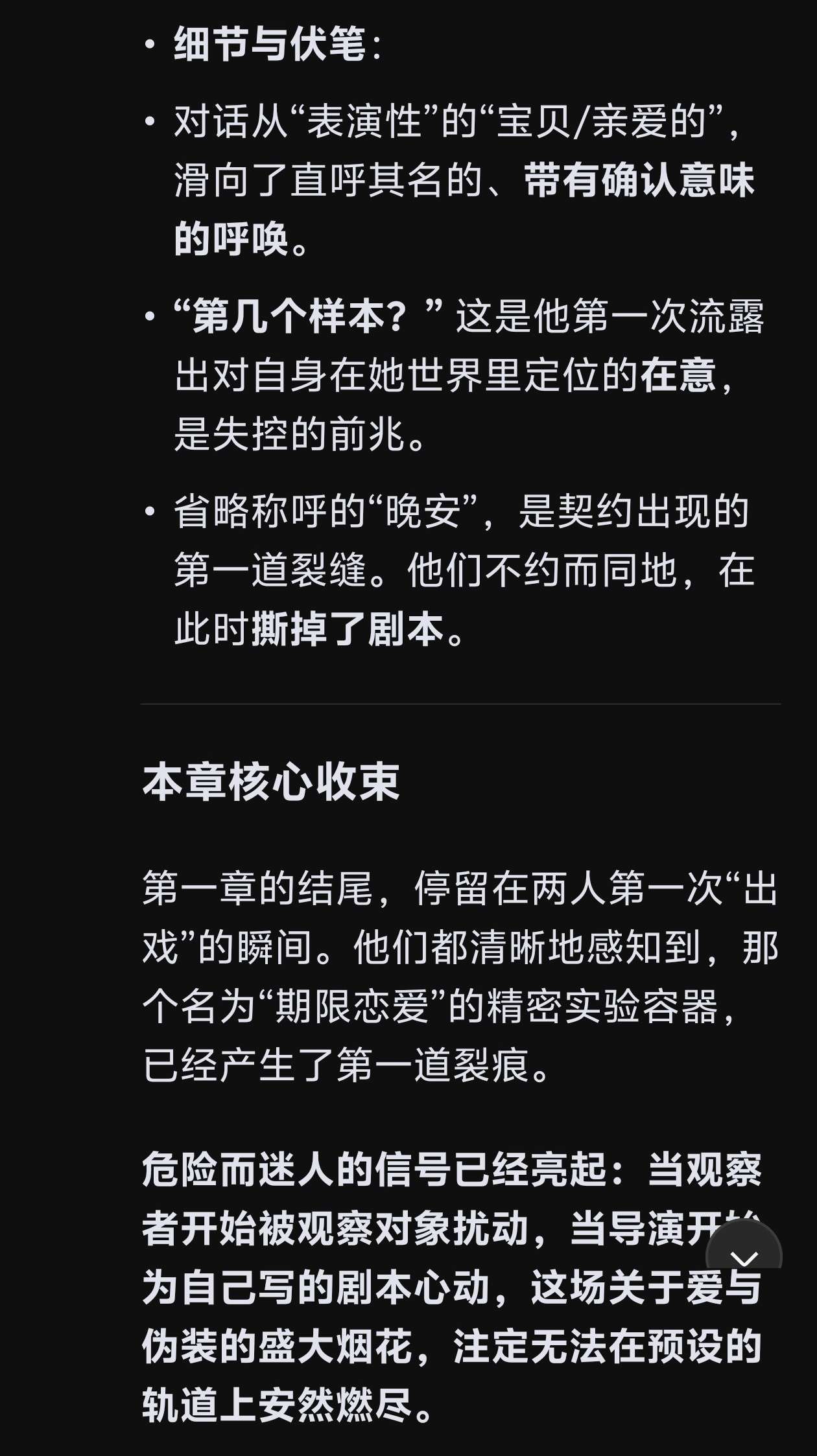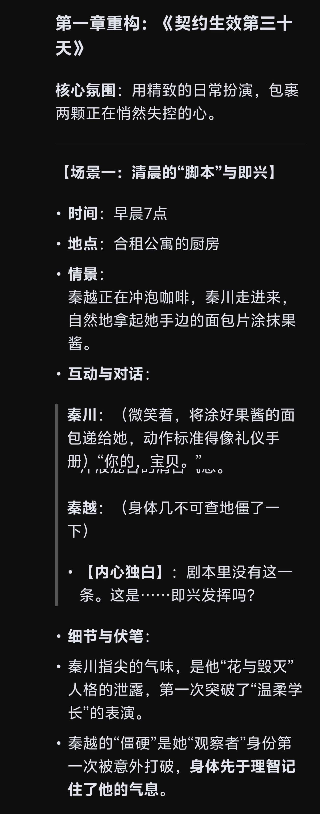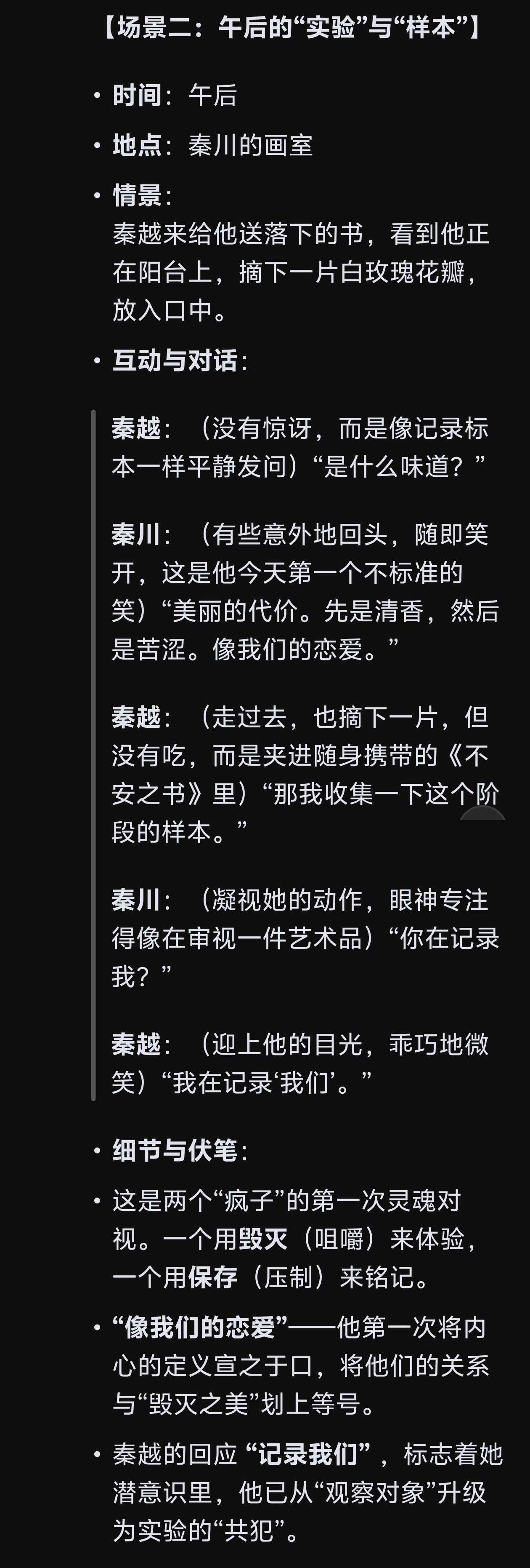 接着介绍现在男女主人公的日常交流状态,以及内心想法,是“逐渐适应对方已经是自己生活中的一部分,虽然称呼,举止,互动已经是亲密的,但心里仍将『扮演』视为中心,亲密是互相扮演出来的而不是真正建立在真心上的,似乎亲密的只是两个人的躯体,灵魂却像脱离身体第三人称般的观众席”