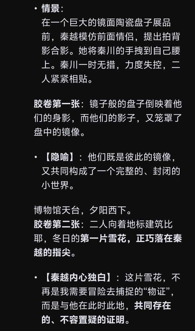 “故事由现实经历改编而来”对于秦川和秦越的设计,我感觉我投射了许多我认识的人的个性,但他们本质上大概是我自己的不同面,美好的回忆,被认为是幸福的碎片在第一时间被想起,便成为了我眼中“浪漫”的模样.某种意义上可以算水仙(?)不过接下来,更多是把碎片化的感受和情景连接起来,我想按照季节作为篇章来写,一二三都是冬天,第四章还不确定是最后一章冬还是插叙一章春,话说真的不知道脑子里有什么情节可以夹在春天里吧
