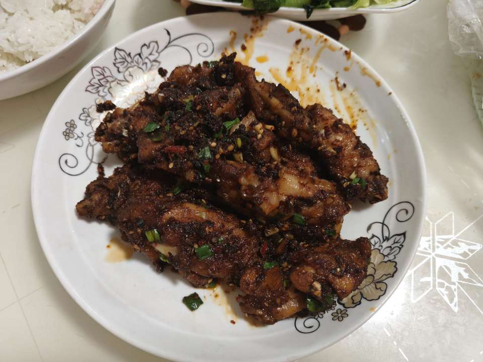 晚饭,我掌勺的,好吃,鸡翅一咬就可以带下来,还带着孜然的微香(放的孜然粉比较少)。萝卜干是外婆家去年做的,现在炒起来微苦,之后过节的时候再让她给点新做的,应该会比较好。今天的米里水放少了,我不喜欢吃太干的,饭只吃了一碗半,鸡翅炫完了。我还是比菜要软的饭,感觉口感会比较好,妈妈说我做的鸡翅比她做的要嫩一些,我也觉得如此,大概是因为在腌肉的时候我把它们套袋之后蒸了一会,于是水分就多了,下一步又是油炸定型,没蒸的话就像往常一样比较干了