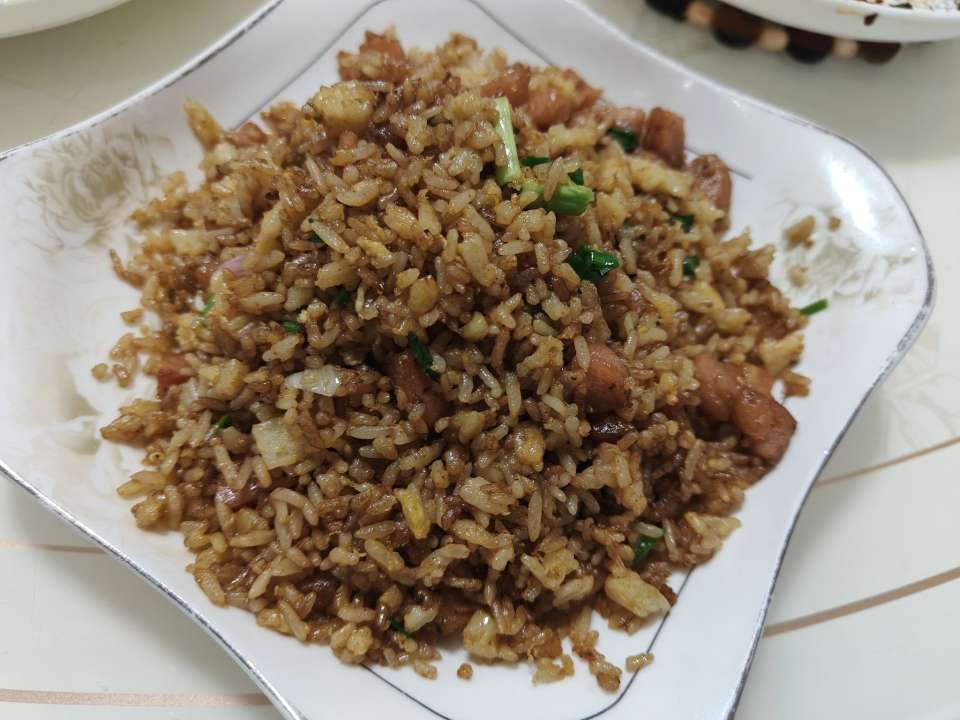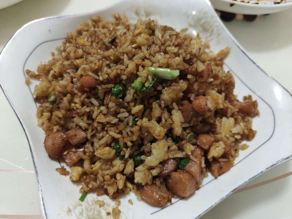 火腿肠蛋炒饭,米粒香甜不腻,火腿肠微焦弹口,这一碗拌了两个鸡蛋,感觉下次做可以多放一个鸡蛋因为有点饭没拌到蛋液然后炒的时候没分离,还有火可以调大一点,感觉火大容易分粒(调大火的时候还可以看到有些饭粒在锅里蹦哒),我下次做的时候还应该多加葱,因为我喜欢吃葱。
