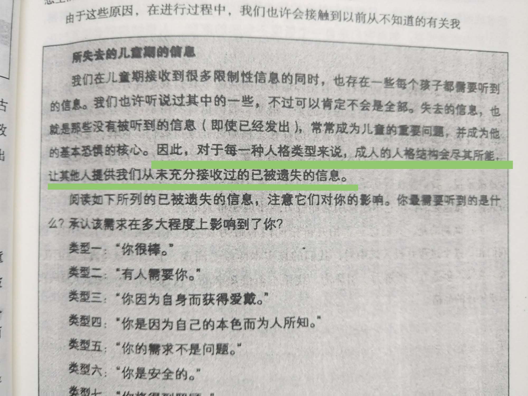 “因此,对于每一种人格类型来说,成人的人格类型会尽其所能,让其他人提供我们从未接受过的已遗失的信息”