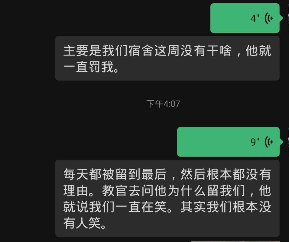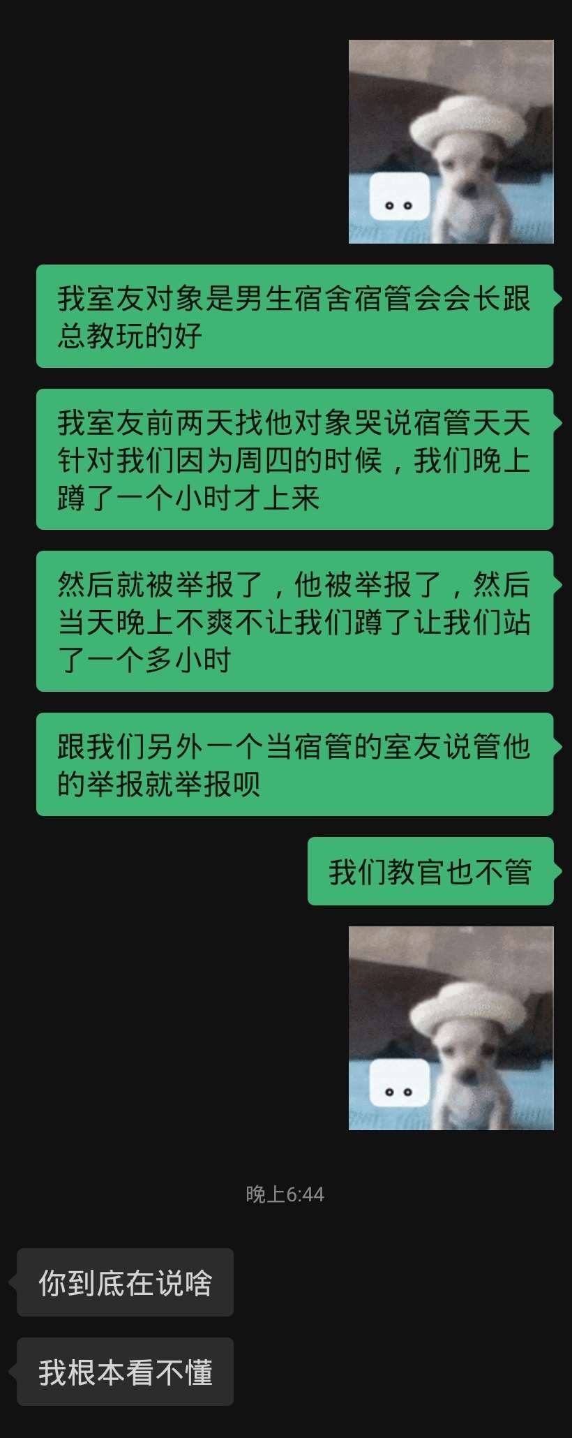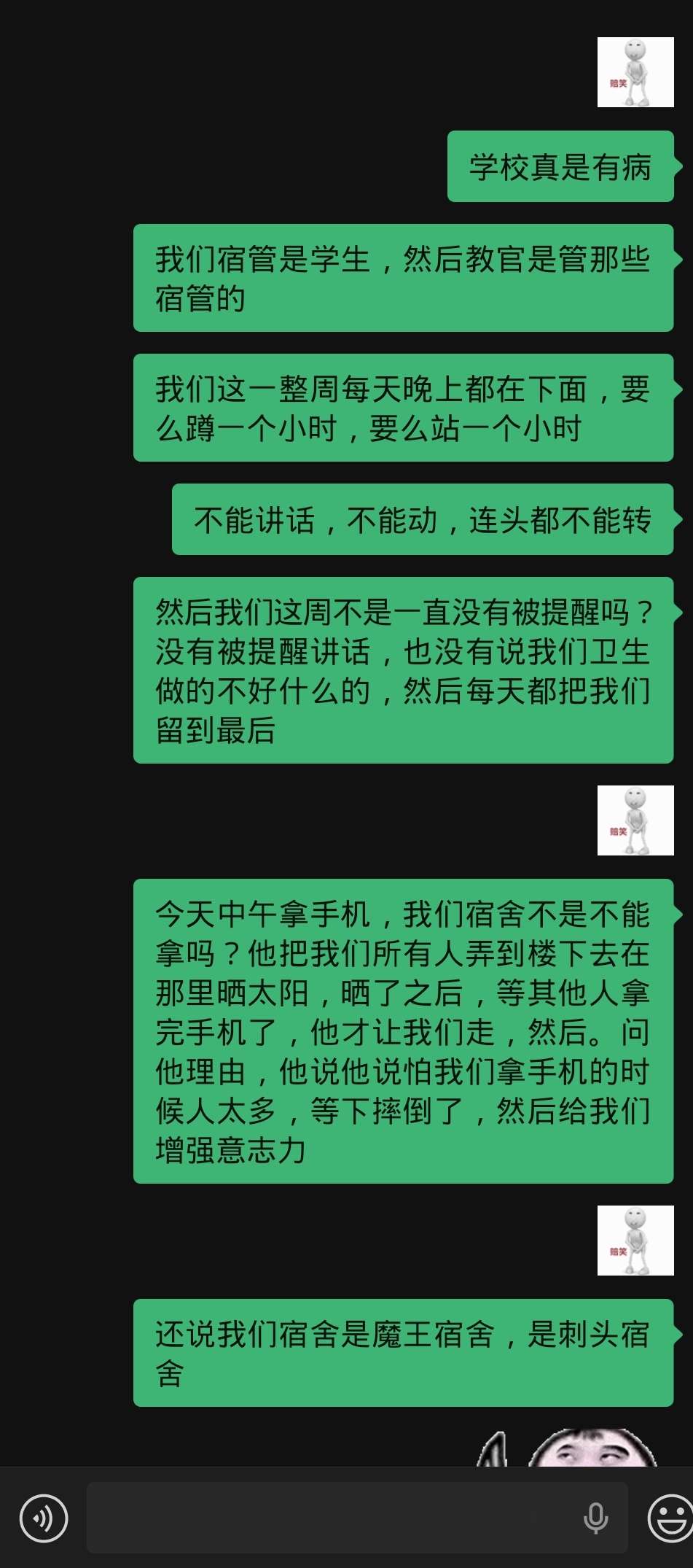 上周日催吐了周一也是周二后面感觉一直这样不太好所以就算很想吐也没有吐,还是一直暴饮暴食控制不住的,我们宿舍一直在被宿管针对,每天晚上明明什么都没干但是就是被罚到最后,我不记得宿管他们骂我们什么了反正都不是什么正常的理由,我只记得他们一直在笑像霸凌的那种笑,他们一直罚我们教官来问就找理由。我很多细节都不记得了我只记得他们一直在笑,蹲一个小时站一个小时动不了真的很难受。我周五终于拿到手机了吐槽根本不知道自己在说什么好乱好乱😥