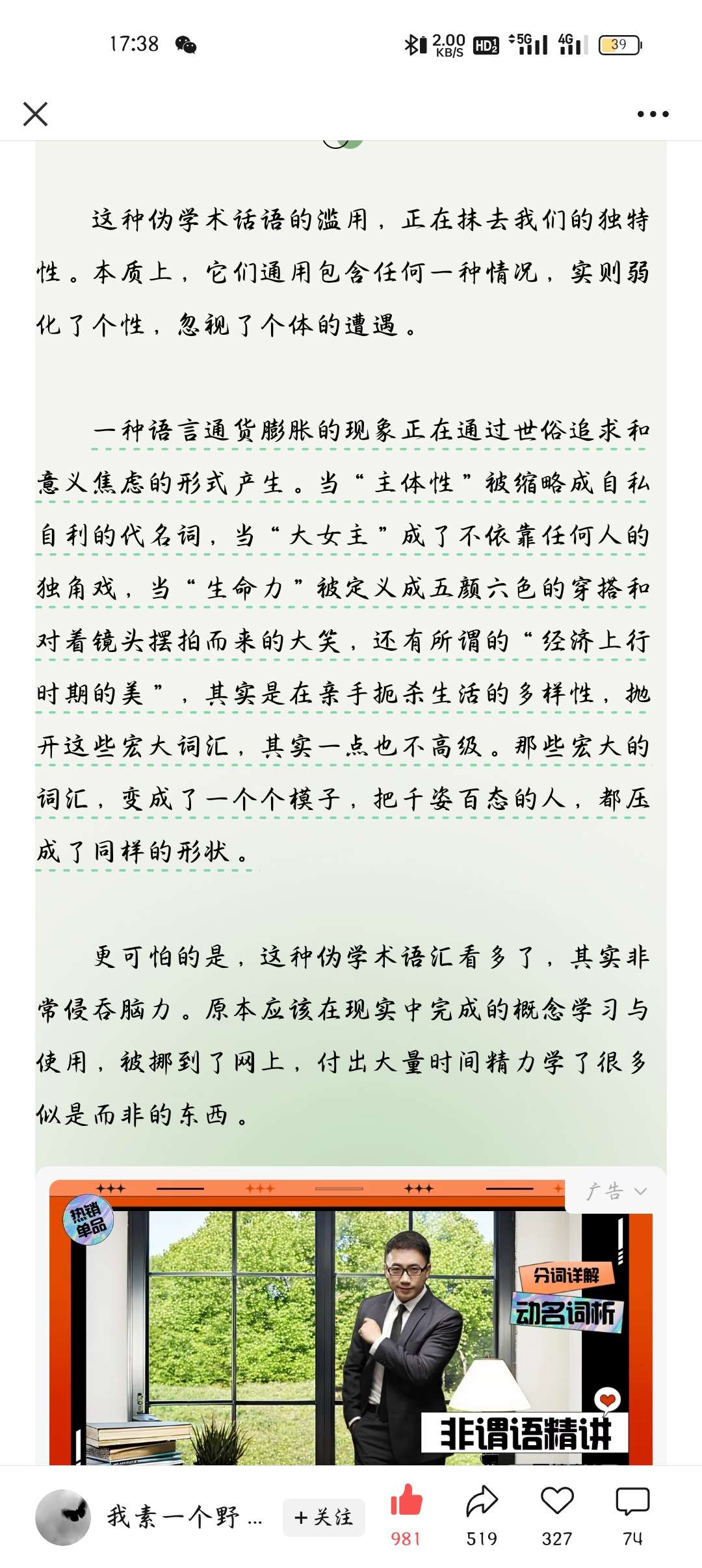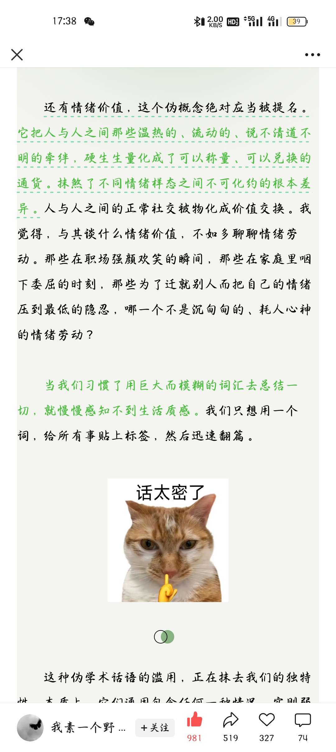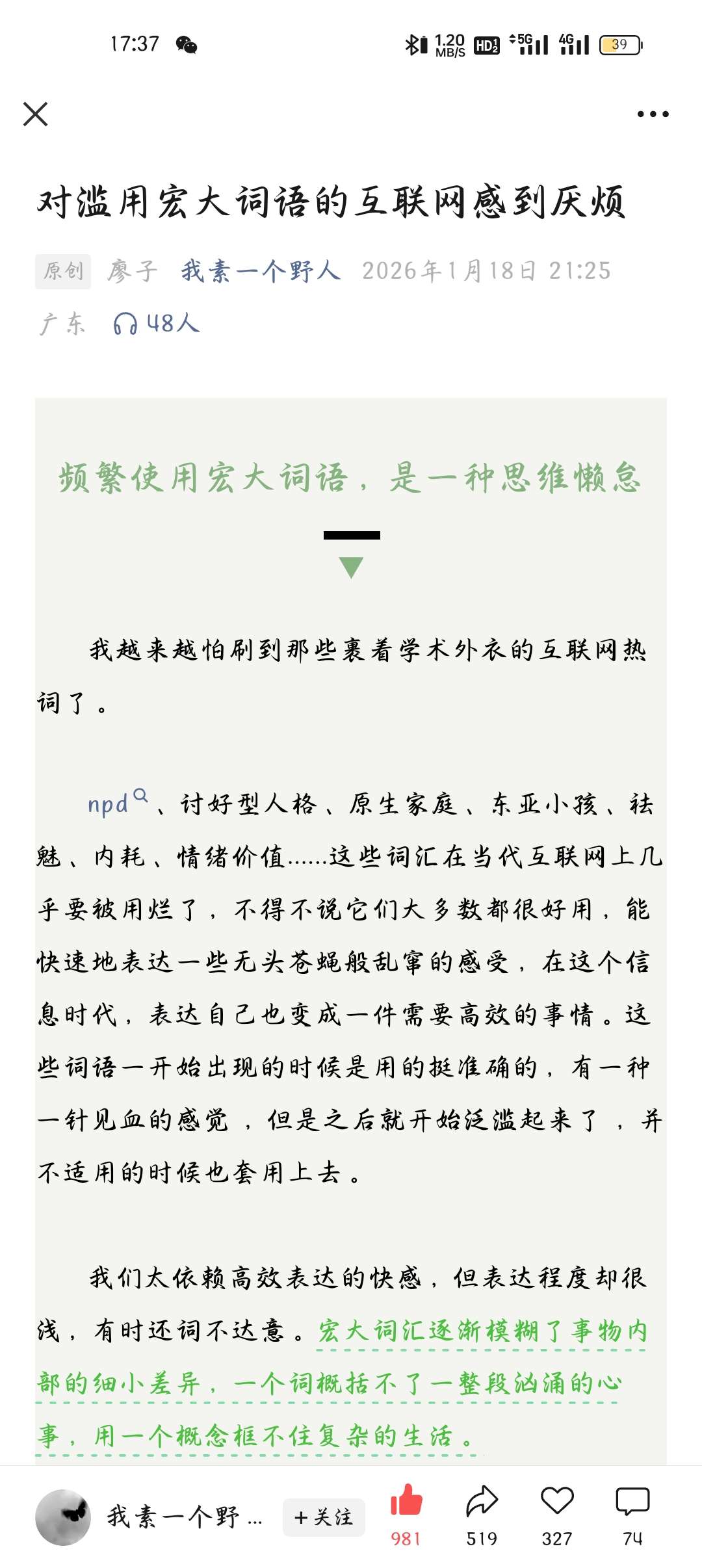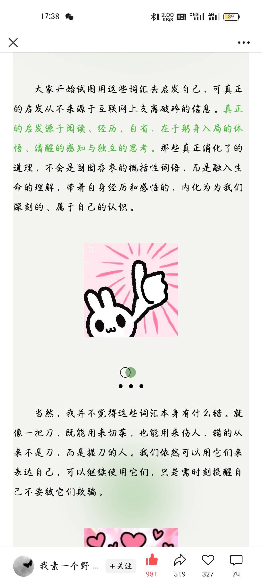 现在互联网发展,ai发展迅速,但说到底,ai也就是收集加整合资料的一个工具,很多人反而把他奉为圭臬,动不动就是“ai是这样说的”,我之前有一段时间也经常用ai,感觉到自己思维逻辑大幅下降,还是要克制以及明确使用方法和目的
