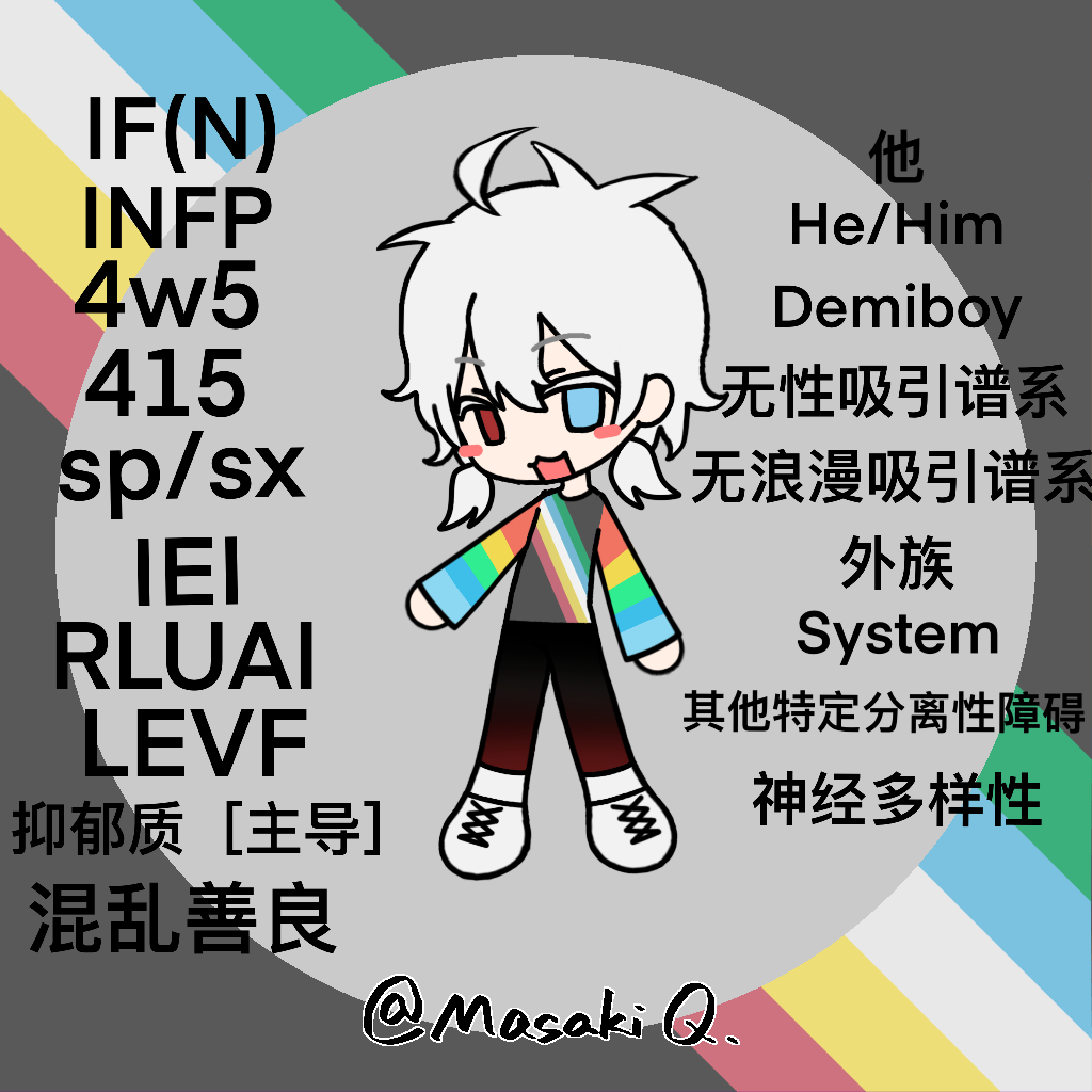 唉身份证,我时至今日仍未知道自己到底是aroace谱系中的哪个细分。探索路程为灰色浪漫吸引/波动无性吸引→畏浪漫型无浪漫吸引/无归属无性吸引→虚拟吸引……?无我吸引……?→我到底是啥东西?!