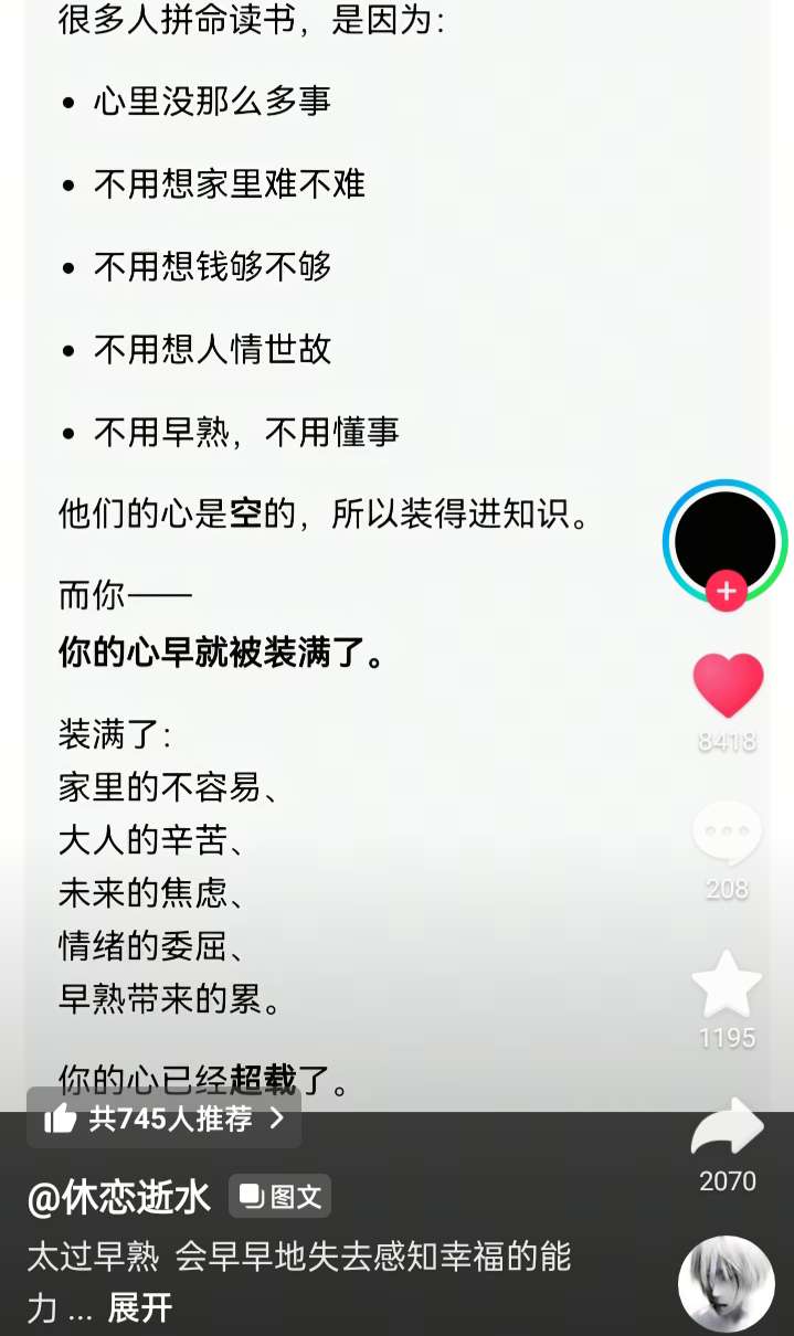或许是这样吧,上课发呆想的是今天在学校花了多少钱,明天是不是该省一点,到学校的第一堂课想的是家人那句刺痛的话和那些抱怨那些期盼。