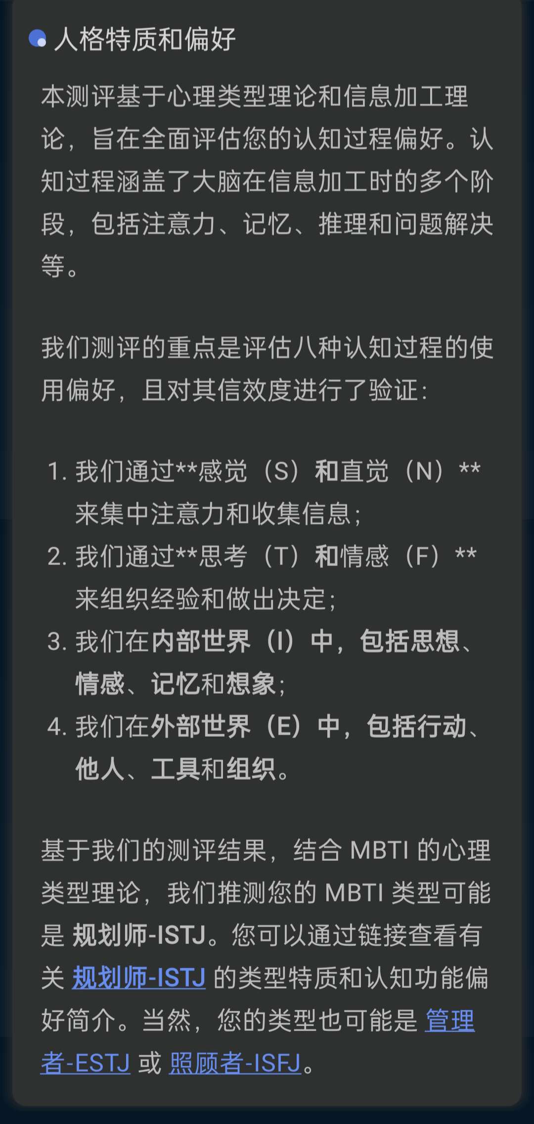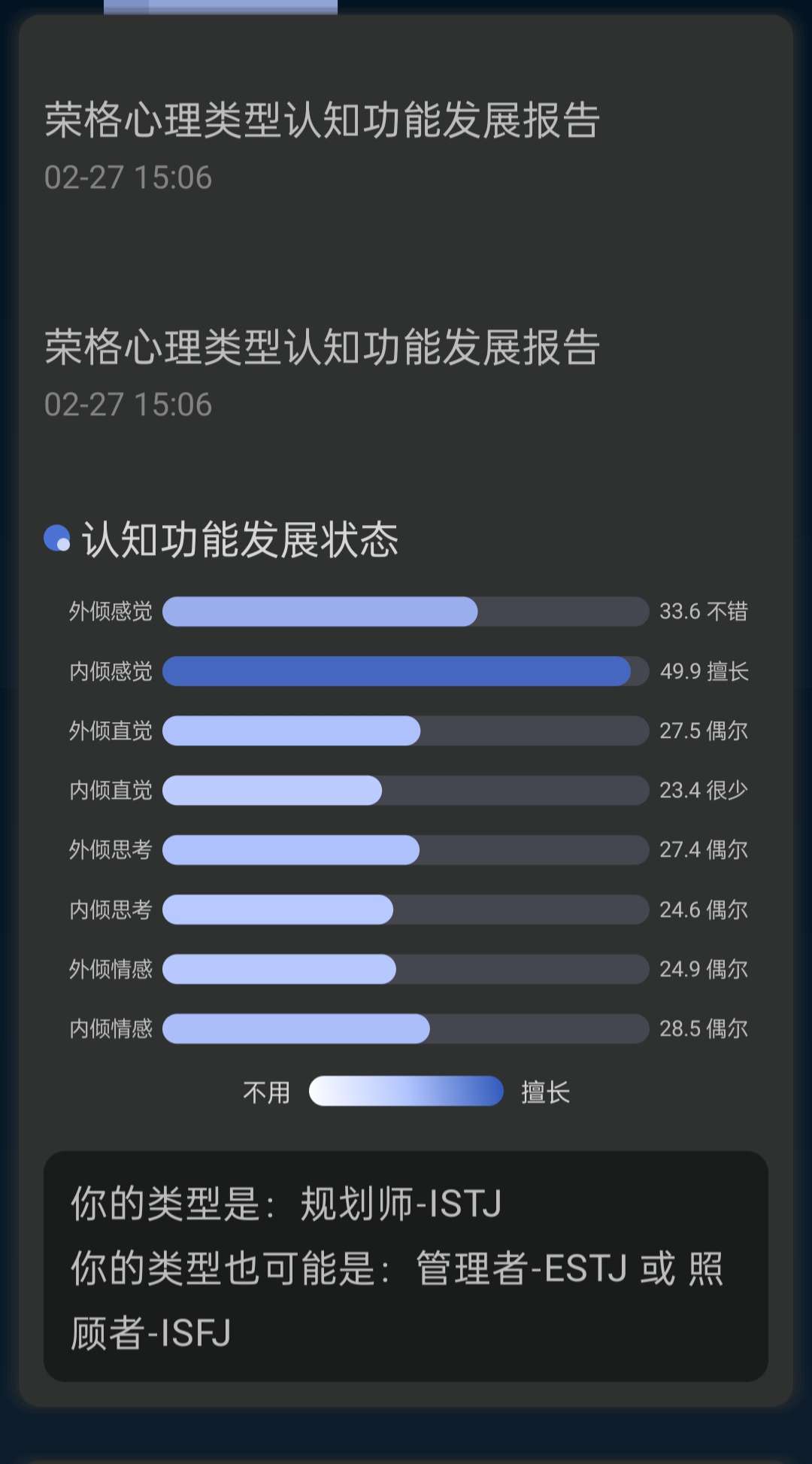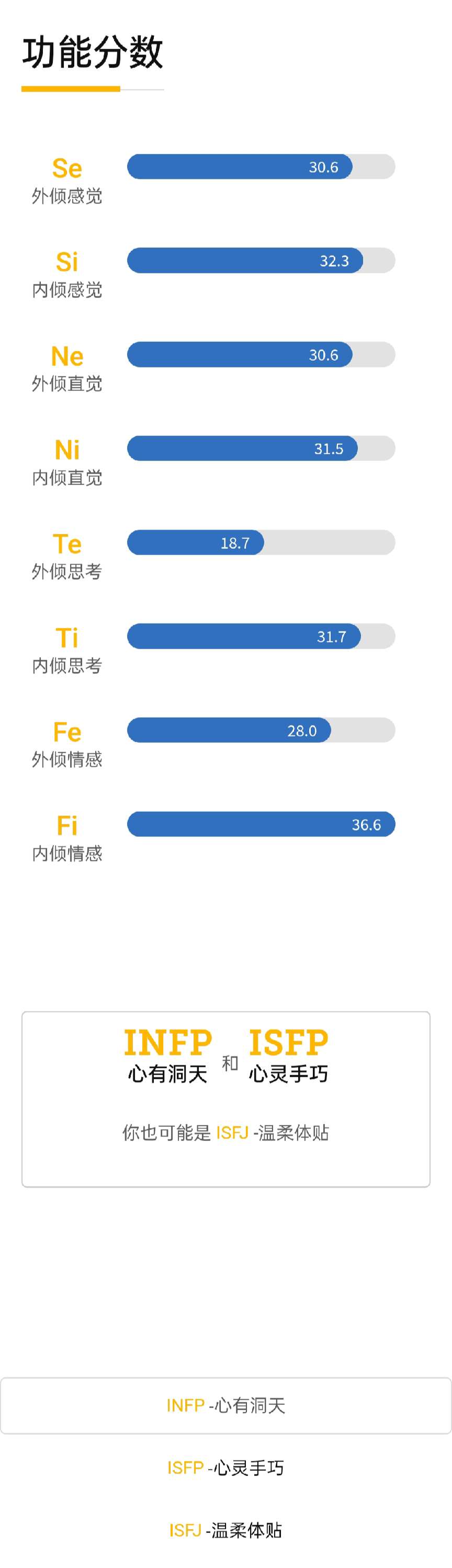 我去,我怎么测出了istj,去年我去测是isfp+infp,整个性格的大转变,我还以为我还是isfp+infp,服了,就是为什么一直都有isfj这个人恪是不是我认清了现实,对这个世界感到了悲伤如果是真爱,我觉得我还是infp+isfp😢最后一张是去年测的