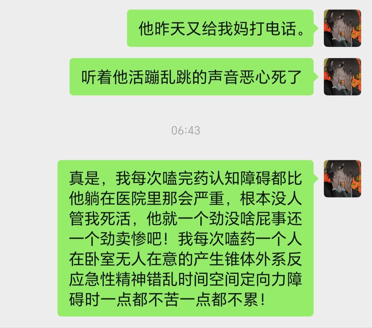 啊,说回来我讨厌的人听到别人谴责日军犯下的战争罪行时会说日本已经道歉了,他不想听这些。虽然我没有什么民族认同感,但无关国家,我认为任何侵略战争都是无法被原谅的,道歉仅仅只是本分而已,而作为非当事者的我们又有什么资格去原谅呢。他很喜欢日本的艺术作品,但这不是给他国套上完美滤镜的理由,他现在最喜欢的乐队是我和他没闹掰以前他通过我的分享才接触到的,想想真晦气,恶心的要死了,这个混球啥时候再把药当糖豆吃来逗我开心呢,就他那怂样恐怕要等好久了,他吃了那点量的药就闹的要死要活的真他爹搞笑啊!都不够我塞牙缝的。还说什么希望自己死了有人给他扫墓上坟,想啥呢,早点死呗我去化粪池挑几桶顶级肥料去上坟。