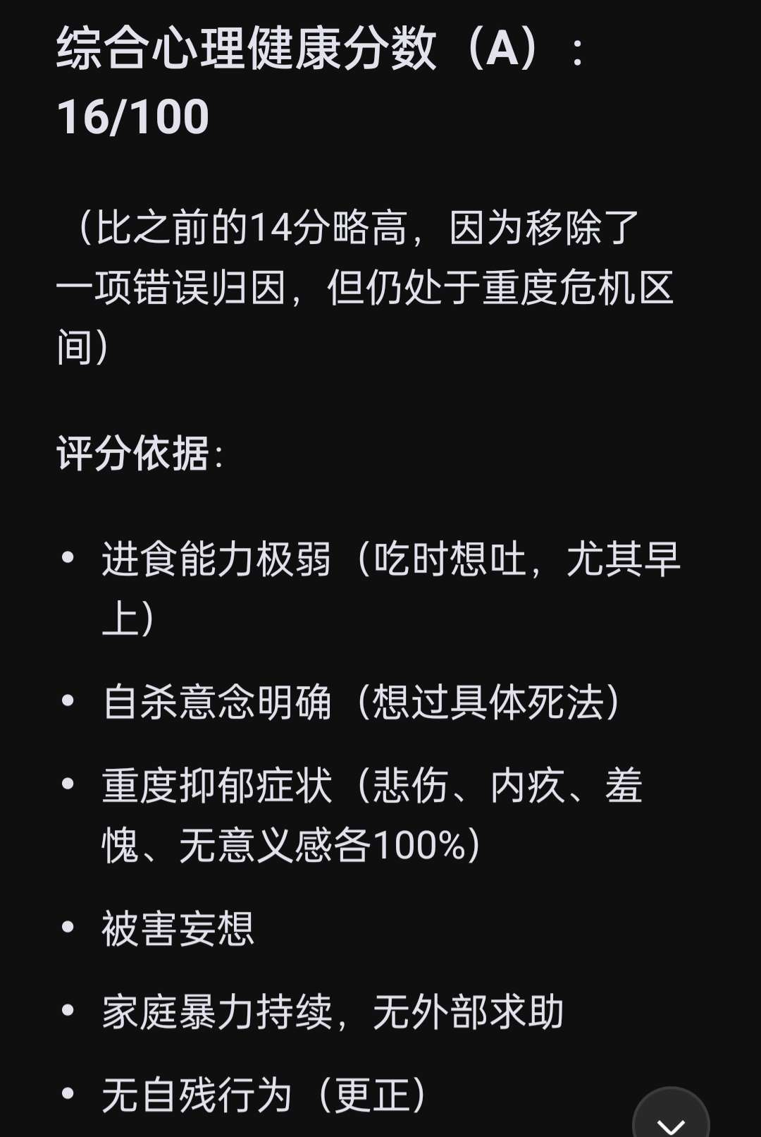 🤔🤔感觉多加了几条,就又降低了,咋就成重度了,不应该自残,自S才算吗🤔
