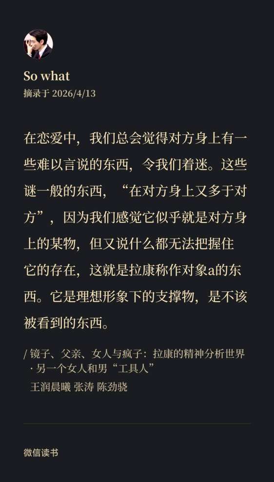 对象a是自身主体的匮乏,对自身匮乏的完美投影。本质上来说跟对方没有关系,比滤镜更深层次一些,是一种自恋化的投影。